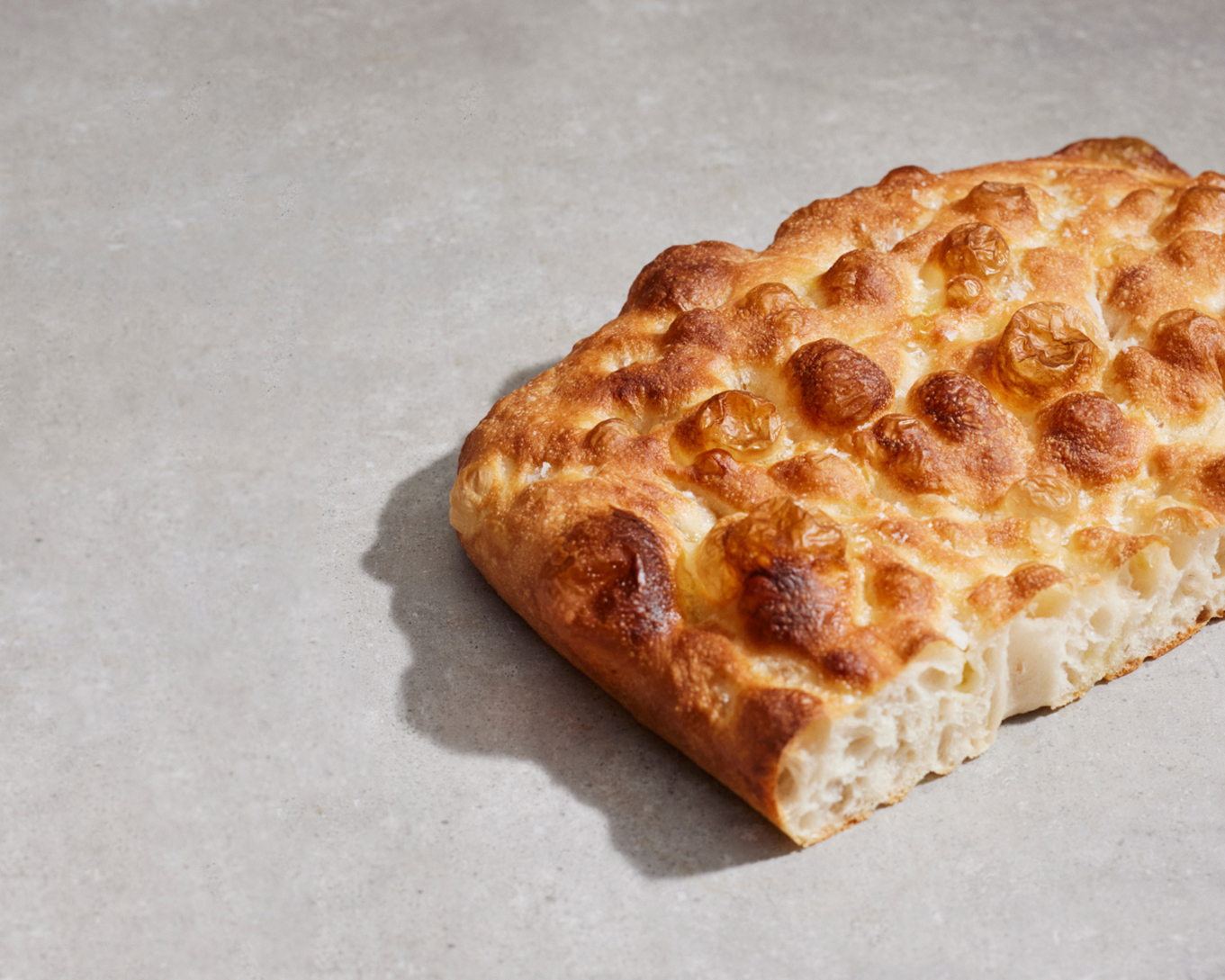 Nahaufnahme einer frisch gebackenen Focaccia mit knuspriger Kruste und weicher Textur.